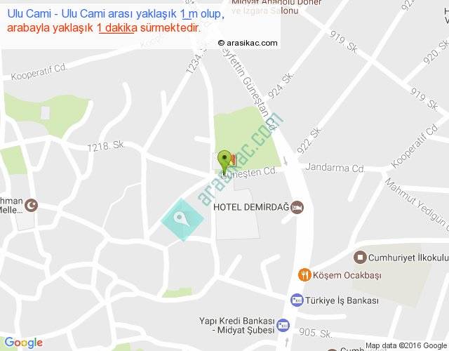 Ulu Cami - Ulu Cami arası yaklaşık olarak 90 km/h ile yukarıda belirtilen sürede olup, iki yerin kuş uçuşu uzaklığı (mesafesi) 0'dir. Yolculuk otobüsle 1 dakika sürmektedir.