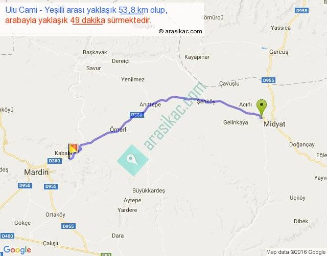 Ulu Cami - Yeşilli arası yaklaşık olarak 90 km/h ile yukarıda belirtilen sürede olup, iki yerin kuş uçuşu uzaklığı (mesafesi) 46'dir. Yolculuk otobüsle 1 saat 3 dakika sürmektedir.