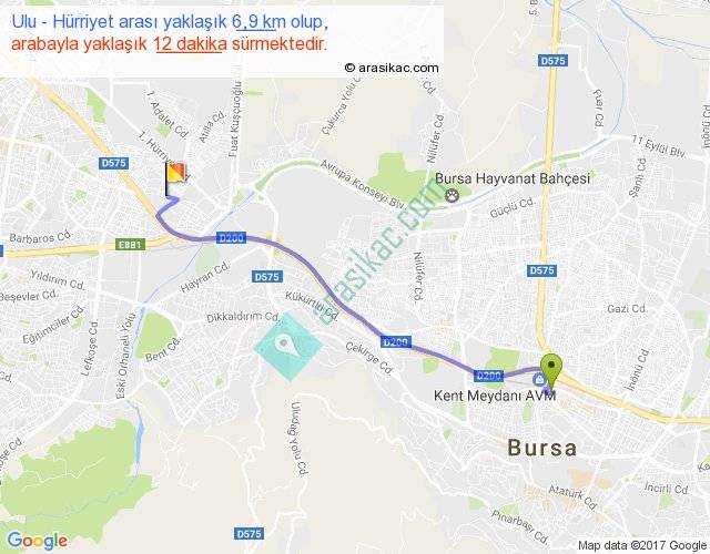 Ulu - Hürriyet arası yaklaşık olarak 90 km/h ile yukarıda belirtilen sürede olup, iki yerin kuş uçuşu uzaklığı (mesafesi) 6'dir. Yolculuk otobüsle 15 dakika sürmektedir.