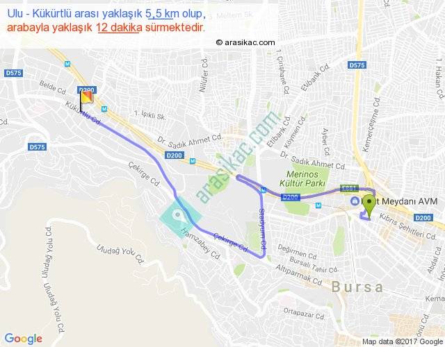 Ulu - Kükürtlü arası yaklaşık olarak 90 km/h ile yukarıda belirtilen sürede olup, iki yerin kuş uçuşu uzaklığı (mesafesi) 3'dir. Yolculuk otobüsle 15 dakika sürmektedir.
