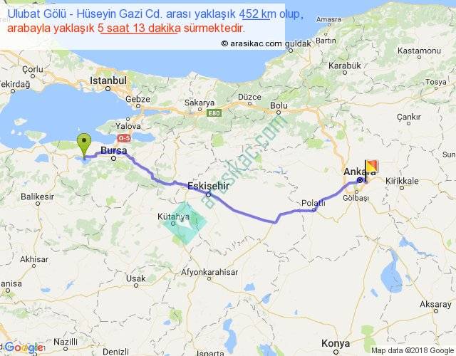Ulubat Gölü - Hüseyin Gazi Cd. arası yaklaşık olarak 90 km/h ile yukarıda belirtilen sürede olup, iki yerin kuş uçuşu uzaklığı (mesafesi) 368'dir. Eğer belirtilen yerler arasında uçak seferi var ise bu süre uçakla 33 dakika'ya kadar düşebilir. Yolculuk otobüsle 6 saat 46 dakika sürmektedir.