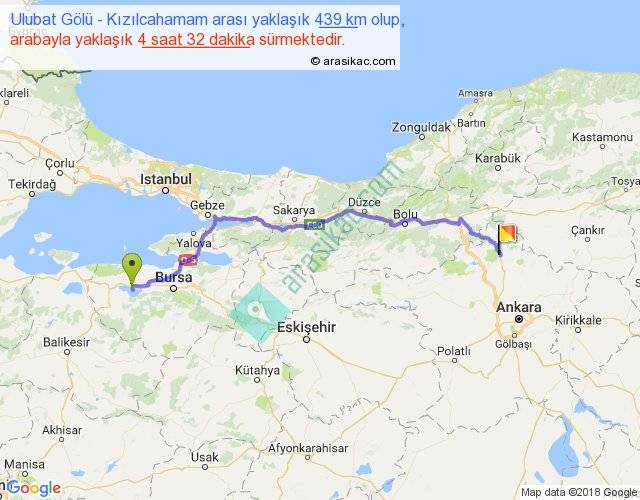Ulubat Gölü - Kızılcahamam arası yaklaşık olarak 90 km/h ile yukarıda belirtilen sürede olup, iki yerin kuş uçuşu uzaklığı (mesafesi) 342'dir. Eğer belirtilen yerler arasında uçak seferi var ise bu süre uçakla 31 dakika'ya kadar düşebilir. Yolculuk otobüsle 5 saat 53 dakika sürmektedir.