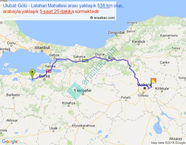 Ulubat Gölü - Lalahan Mahallesi arası yaklaşık olarak 90 km/h ile yukarıda belirtilen sürede olup, iki yerin kuş uçuşu uzaklığı (mesafesi) 381'dir. Eğer belirtilen yerler arasında uçak seferi var ise bu süre uçakla 35 dakika'ya kadar düşebilir. Yolculuk otobüsle 7 saat 2 dakika sürmektedir.