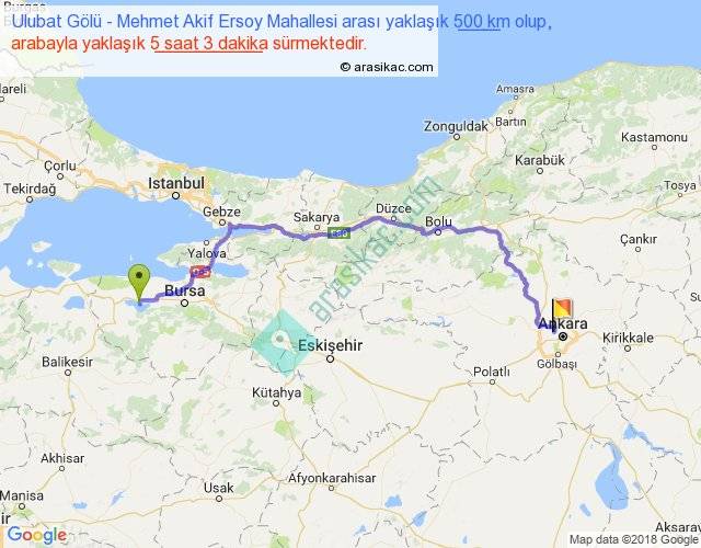 Ulubat Gölü - Mehmet Akif Ersoy Mahallesi arası yaklaşık olarak 90 km/h ile yukarıda belirtilen sürede olup, iki yerin kuş uçuşu uzaklığı (mesafesi) 352'dir. Eğer belirtilen yerler arasında uçak seferi var ise bu süre uçakla 32 dakika'ya kadar düşebilir. Yolculuk otobüsle 6 saat 33 dakika sürmektedir.