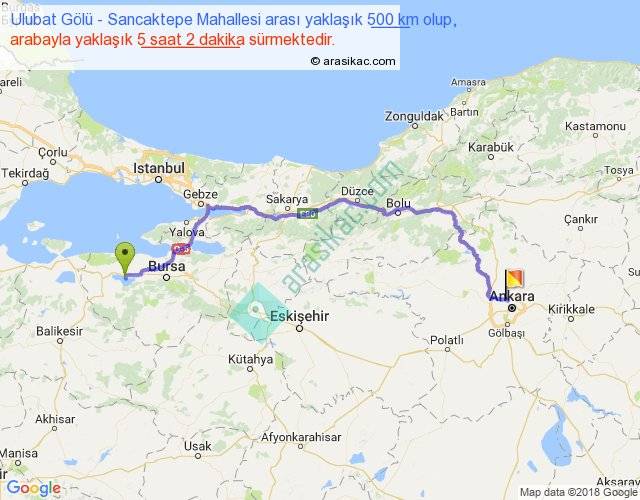 Ulubat Gölü - Sancaktepe Mahallesi arası yaklaşık olarak 90 km/h ile yukarıda belirtilen sürede olup, iki yerin kuş uçuşu uzaklığı (mesafesi) 355'dir. Eğer belirtilen yerler arasında uçak seferi var ise bu süre uçakla 32 dakika'ya kadar düşebilir. Yolculuk otobüsle 6 saat 32 dakika sürmektedir.