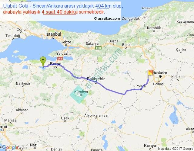 Ulubat Gölü - Sincan Ankara arası yaklaşık olarak 90 km/h ile yukarıda belirtilen sürede olup, iki yerin kuş uçuşu uzaklığı (mesafesi) 325'dir. Eğer belirtilen yerler arasında uçak seferi var ise bu süre uçakla 30 dakika'ya kadar düşebilir. Yolculuk otobüsle 6 saat 4 dakika sürmektedir.