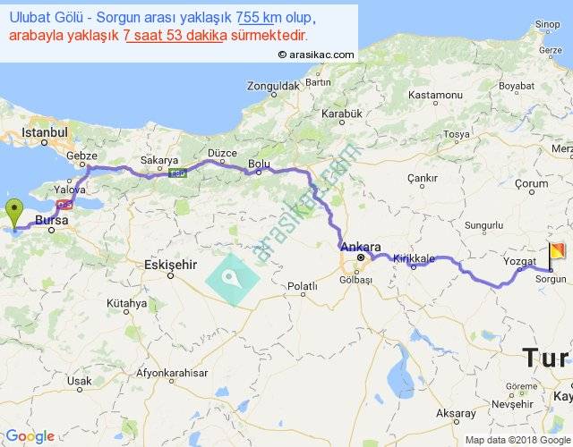 Ulubat Gölü - Sorgun arası yaklaşık olarak 90 km/h ile yukarıda belirtilen sürede olup, iki yerin kuş uçuşu uzaklığı (mesafesi) 558'dir. Eğer belirtilen yerler arasında uçak seferi var ise bu süre uçakla 51 dakika'ya kadar düşebilir. Yolculuk otobüsle 10 saat 14 dakika sürmektedir.