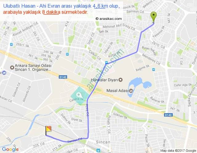 Ulubatlı Hasan - Ahi Evran arası yaklaşık olarak 90 km/h ile yukarıda belirtilen sürede olup, iki yerin kuş uçuşu uzaklığı (mesafesi) 4'dir. Yolculuk otobüsle 10 dakika sürmektedir.
