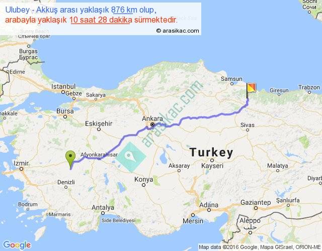 Ulubey - Akkuş arası yaklaşık olarak 90 km/h ile yukarıda belirtilen sürede olup, iki yerin kuş uçuşu uzaklığı (mesafesi) 708'dir. Eğer belirtilen yerler arasında uçak seferi var ise bu süre uçakla 1 saat 05 dakika'ya kadar düşebilir. Yolculuk otobüsle 13 saat 36 dakika sürmektedir.