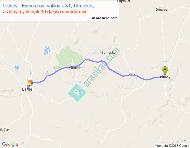 Ulubey - Eşme arası yaklaşık olarak 90 km/h ile yukarıda belirtilen sürede olup, iki yerin kuş uçuşu uzaklığı (mesafesi) 28'dir. Yolculuk otobüsle 39 dakika sürmektedir.