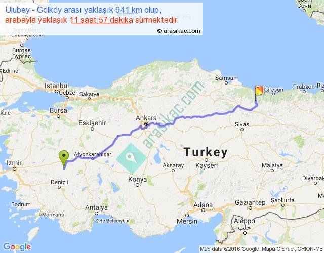 Ulubey - Gölköy arası yaklaşık olarak 90 km/h ile yukarıda belirtilen sürede olup, iki yerin kuş uçuşu uzaklığı (mesafesi) 752'dir. Eğer belirtilen yerler arasında uçak seferi var ise bu süre uçakla 1 saat 09 dakika'ya kadar düşebilir. Yolculuk otobüsle 15 saat 32 dakika sürmektedir.