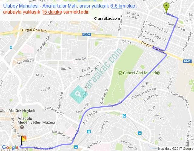 Ulubey Mahallesi - Anafartalar Mah. arası yaklaşık olarak 90 km/h ile yukarıda belirtilen sürede olup, iki yerin kuş uçuşu uzaklığı (mesafesi) 5'dir. Yolculuk otobüsle 19 dakika sürmektedir.