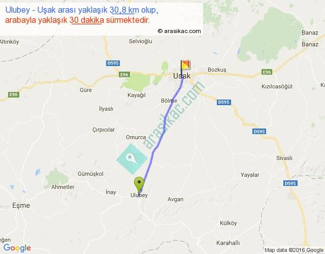 Ulubey - Uşak arası yaklaşık olarak 90 km/h ile yukarıda belirtilen sürede olup, iki yerin kuş uçuşu uzaklığı (mesafesi) 30'dir. Yolculuk otobüsle 39 dakika sürmektedir.