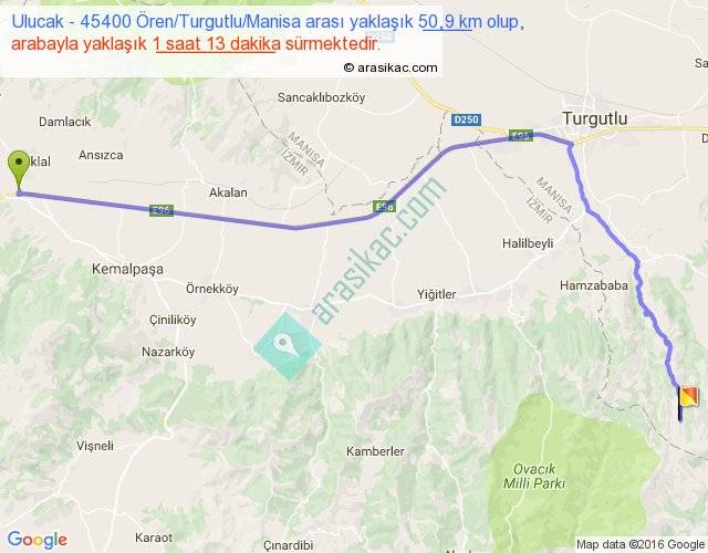Ulucak - 45400 Ören Turgutlu Manisa arası yaklaşık olarak 90 km/h ile yukarıda belirtilen sürede olup, iki yerin kuş uçuşu uzaklığı (mesafesi) 38'dir. Yolculuk otobüsle 1 saat 34 dakika sürmektedir.