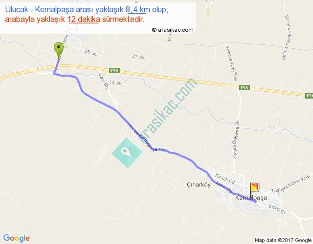 Ulucak - Kemalpaşa arası yaklaşık olarak 90 km/h ile yukarıda belirtilen sürede olup, iki yerin kuş uçuşu uzaklığı (mesafesi) 7'dir. Yolculuk otobüsle 15 dakika sürmektedir.