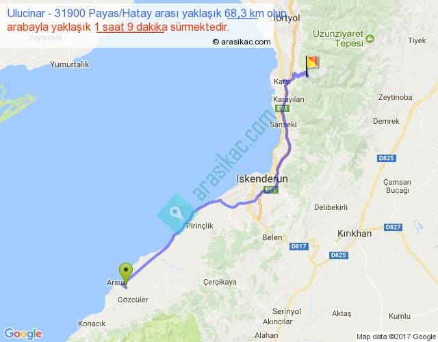 Eğer Ulucinar 31900 Payas Hatay arası ne kadar yakar (benzin/mazot) diyorsanız, kilometrede 3 ₺ yakan bir aracınız var ise 204, km'de 4 ₺ yakan bir aracınız var ise 272, km'de 5 ₺ yakan bir aracınız var ise 340 ile bu yolculuğu tamamlayabilirsiniz.
