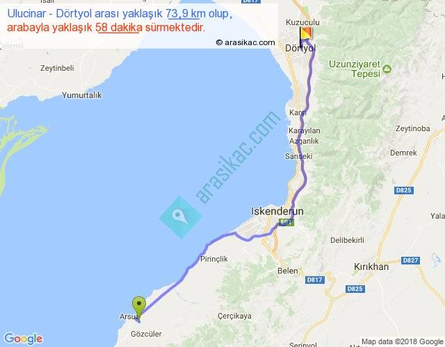 Ulucinar - Dörtyol arası yaklaşık olarak 90 km/h ile yukarıda belirtilen sürede olup, iki yerin kuş uçuşu uzaklığı (mesafesi) 56'dir. Yolculuk otobüsle 1 saat 15 dakika sürmektedir.