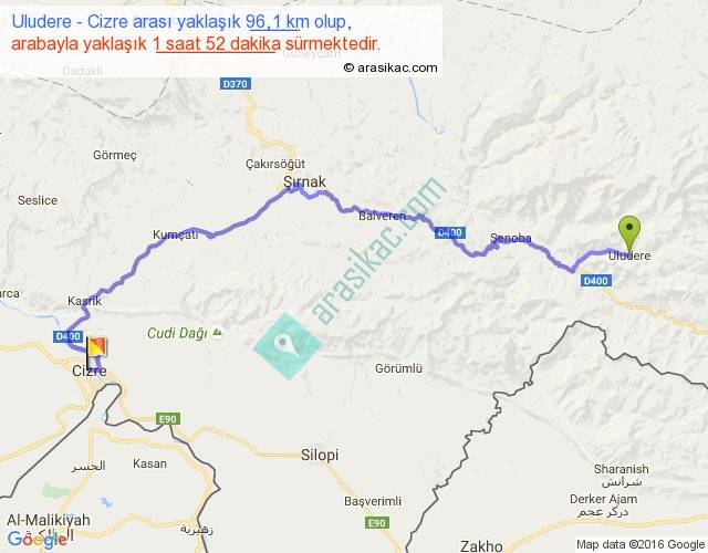 Uludere - Cizre arası yaklaşık olarak 90 km/h ile yukarıda belirtilen sürede olup, iki yerin kuş uçuşu uzaklığı (mesafesi) 60'dir. Yolculuk otobüsle 2 saat 25 dakika sürmektedir.
