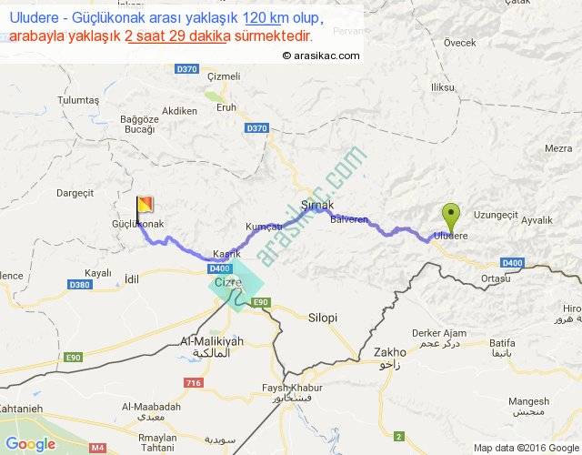 Uludere - Güçlükonak arası yaklaşık olarak 90 km/h ile yukarıda belirtilen sürede olup, iki yerin kuş uçuşu uzaklığı (mesafesi) 83'dir. Yolculuk otobüsle 3 saat 13 dakika sürmektedir.