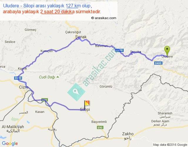 Uludere - Silopi arası yaklaşık olarak 90 km/h ile yukarıda belirtilen sürede olup, iki yerin kuş uçuşu uzaklığı (mesafesi) 40'dir. Yolculuk otobüsle 3 saat 2 dakika sürmektedir.