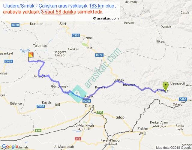 Uludere Şırnak - Çalışkan arası yaklaşık olarak 90 km/h ile yukarıda belirtilen sürede olup, iki yerin kuş uçuşu uzaklığı (mesafesi) 113'dir. Yolculuk otobüsle 5 saat 9 dakika sürmektedir.
