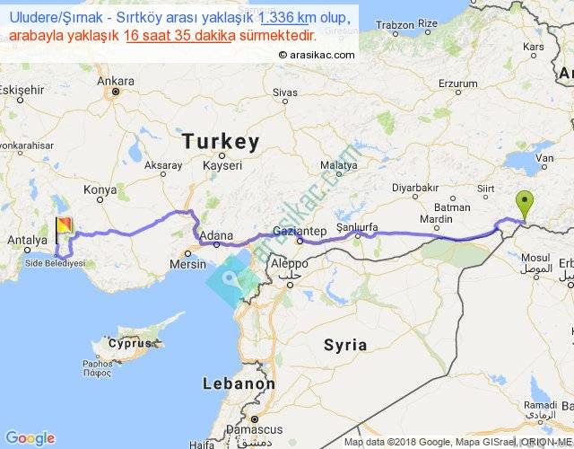 Uludere Şırnak - Sırtköy arası yaklaşık olarak 90 km/h ile yukarıda belirtilen sürede olup, iki yerin kuş uçuşu uzaklığı (mesafesi) 1008'dir. Eğer belirtilen yerler arasında uçak seferi var ise bu süre uçakla 1 saat 33 dakika'ya kadar düşebilir. Yolculuk otobüsle 21 saat 33 dakika sürmektedir.