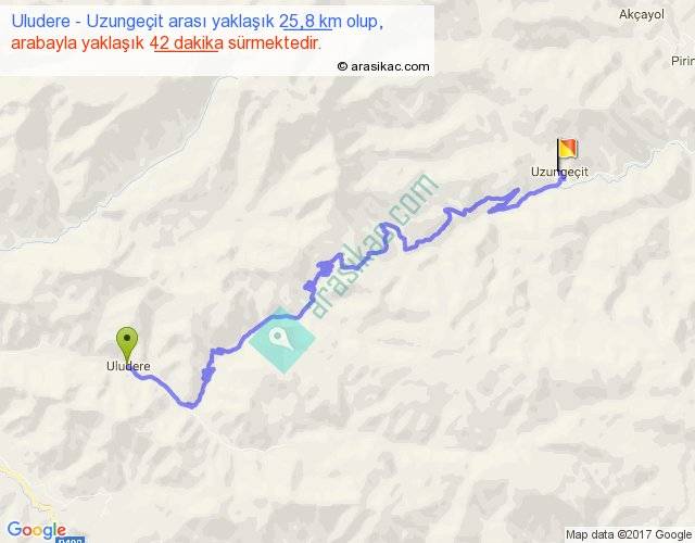 Uludere - Uzungeçit arası yaklaşık olarak 90 km/h ile yukarıda belirtilen sürede olup, iki yerin kuş uçuşu uzaklığı (mesafesi) 13'dir. Yolculuk otobüsle 54 dakika sürmektedir.