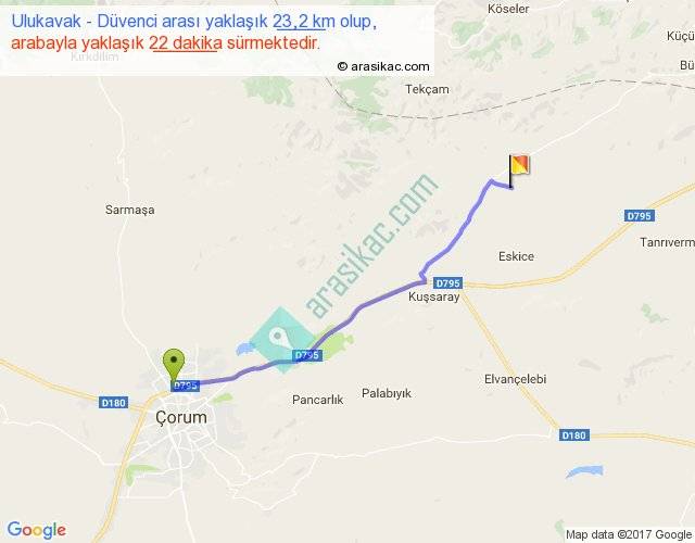 Ulukavak - Düvenci arası yaklaşık olarak 90 km/h ile yukarıda belirtilen sürede olup, iki yerin kuş uçuşu uzaklığı (mesafesi) 21'dir. Yolculuk otobüsle 28 dakika sürmektedir.