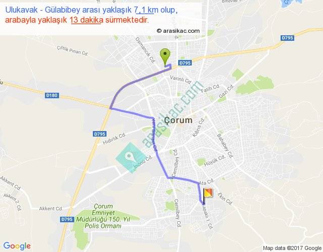 Ulukavak - Gülabibey arası yaklaşık olarak 90 km/h ile yukarıda belirtilen sürede olup, iki yerin kuş uçuşu uzaklığı (mesafesi) 4'dir. Yolculuk otobüsle 16 dakika sürmektedir.
