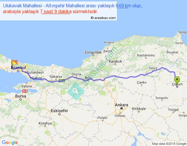 Ulukavak Mahallesi - Altınşehir Mahallesi arası yaklaşık olarak 90 km/h ile yukarıda belirtilen sürede olup, iki yerin kuş uçuşu uzaklığı (mesafesi) 521'dir. Eğer belirtilen yerler arasında uçak seferi var ise bu süre uçakla 48 dakika'ya kadar düşebilir. Yolculuk otobüsle 9 saat 17 dakika sürmektedir.