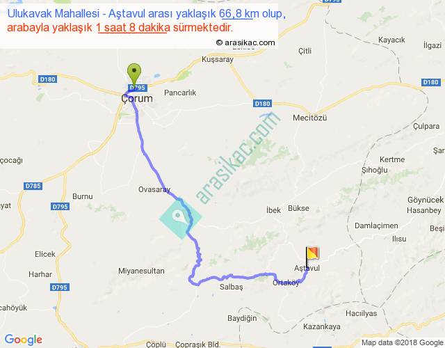 Ulukavak Mahallesi - Aştavul arası yaklaşık olarak 90 km/h ile yukarıda belirtilen sürede olup, iki yerin kuş uçuşu uzaklığı (mesafesi) 41'dir. Yolculuk otobüsle 1 saat 28 dakika sürmektedir.