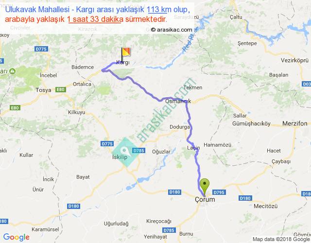 Ulukavak Mahallesi - Kargı arası yaklaşık olarak 90 km/h ile yukarıda belirtilen sürede olup, iki yerin kuş uçuşu uzaklığı (mesafesi) 74'dir. Yolculuk otobüsle 2 saat 0 dakika sürmektedir.