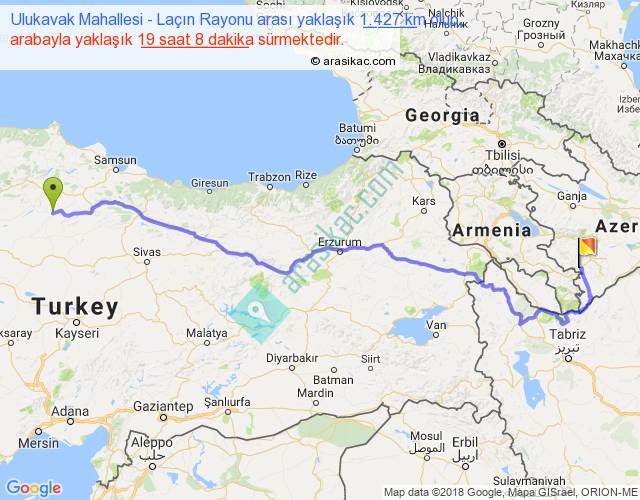 Ulukavak Mahallesi - Laçın Rayonu arası yaklaşık olarak 90 km/h ile yukarıda belirtilen sürede olup, iki yerin kuş uçuşu uzaklığı (mesafesi) 985'dir. Eğer belirtilen yerler arasında uçak seferi var ise bu süre uçakla 1 saat 30 dakika'ya kadar düşebilir. Yolculuk otobüsle 1 gün 0 saat sürmektedir.