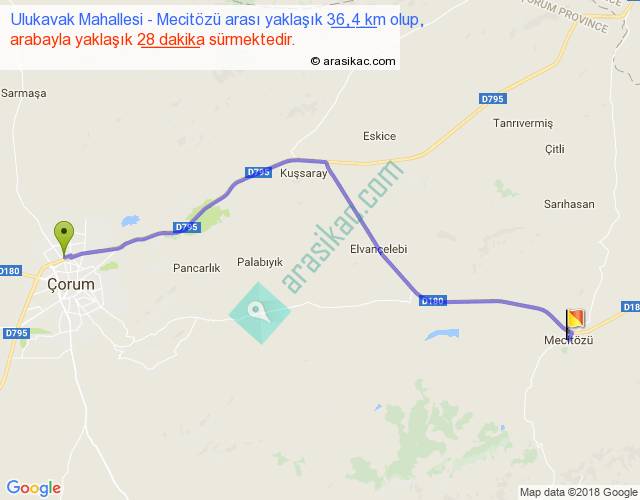 Ulukavak Mahallesi - Mecitözü arası yaklaşık olarak 90 km/h ile yukarıda belirtilen sürede olup, iki yerin kuş uçuşu uzaklığı (mesafesi) 29'dir. Yolculuk otobüsle 36 dakika sürmektedir.