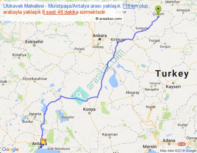 Ulukavak Mahallesi - Muratpaşa Antalya arası yaklaşık olarak 90 km/h ile yukarıda belirtilen sürede olup, iki yerin kuş uçuşu uzaklığı (mesafesi) 543'dir. Eğer belirtilen yerler arasında uçak seferi var ise bu süre uçakla 50 dakika'ya kadar düşebilir. Yolculuk otobüsle 11 saat 26 dakika sürmektedir.