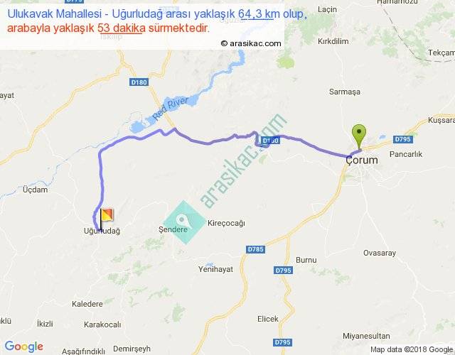 Ulukavak Mahallesi - Uğurludağ arası yaklaşık olarak 90 km/h ile yukarıda belirtilen sürede olup, iki yerin kuş uçuşu uzaklığı (mesafesi) 44'dir. Yolculuk otobüsle 1 saat 8 dakika sürmektedir.