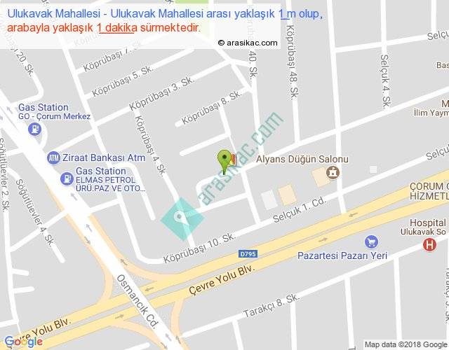 Ulukavak Mahallesi - Ulukavak Mahallesi arası yaklaşık olarak 90 km/h ile yukarıda belirtilen sürede olup, iki yerin kuş uçuşu uzaklığı (mesafesi) 0'dir. Yolculuk otobüsle 1 dakika sürmektedir.