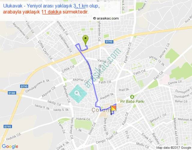 Ulukavak - Yeniyol arası yaklaşık olarak 90 km/h ile yukarıda belirtilen sürede olup, iki yerin kuş uçuşu uzaklığı (mesafesi) 2'dir. Yolculuk otobüsle 14 dakika sürmektedir.