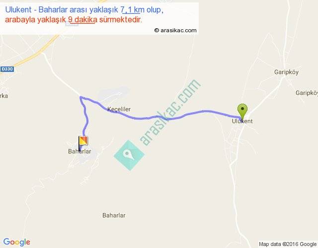 Ulukent - Baharlar arası yaklaşık olarak 90 km/h ile yukarıda belirtilen sürede olup, iki yerin kuş uçuşu uzaklığı (mesafesi) 5'dir. Yolculuk otobüsle 11 dakika sürmektedir.