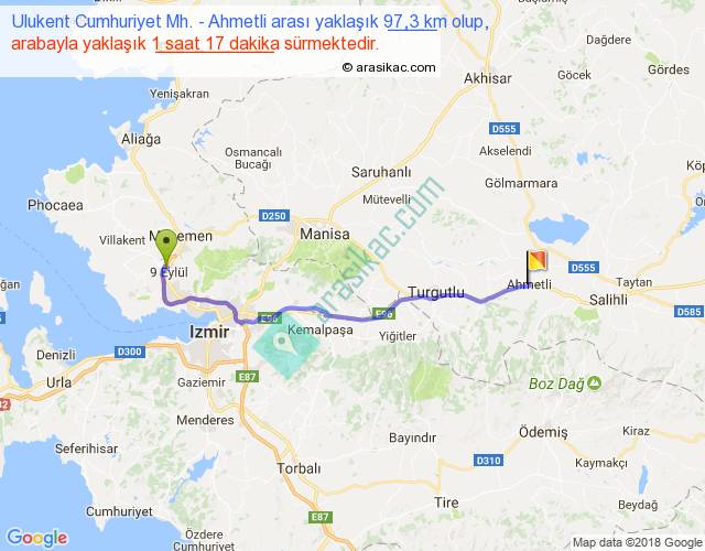 Ulukent Cumhuriyet Mh. - Ahmetli arası yaklaşık olarak 90 km/h ile yukarıda belirtilen sürede olup, iki yerin kuş uçuşu uzaklığı (mesafesi) 78'dir. Yolculuk otobüsle 1 saat 40 dakika sürmektedir.