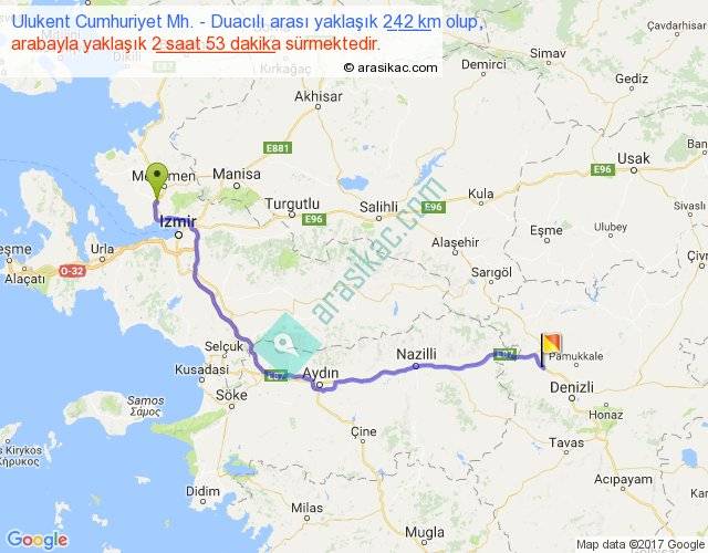 Ulukent Cumhuriyet Mh. - Duacılı arası yaklaşık olarak 90 km/h ile yukarıda belirtilen sürede olup, iki yerin kuş uçuşu uzaklığı (mesafesi) 181'dir. Yolculuk otobüsle 3 saat 44 dakika sürmektedir.