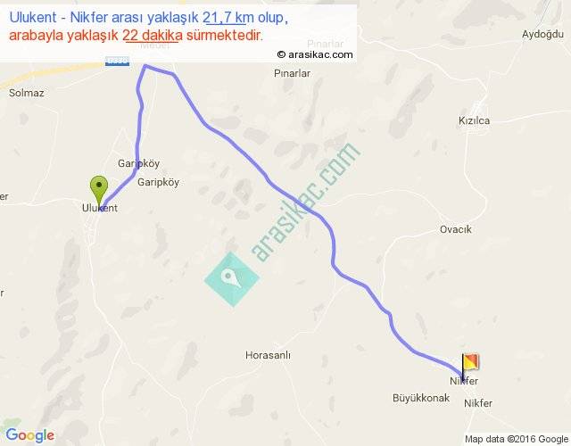 Ulukent - Nikfer arası yaklaşık olarak 90 km/h ile yukarıda belirtilen sürede olup, iki yerin kuş uçuşu uzaklığı (mesafesi) 14'dir. Yolculuk otobüsle 28 dakika sürmektedir.