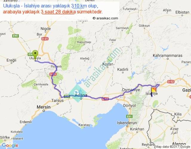 Ulukışla - İslahiye arası yaklaşık olarak 90 km/h ile yukarıda belirtilen sürede olup, iki yerin kuş uçuşu uzaklığı (mesafesi) 197'dir. Yolculuk otobüsle 4 saat 30 dakika sürmektedir.