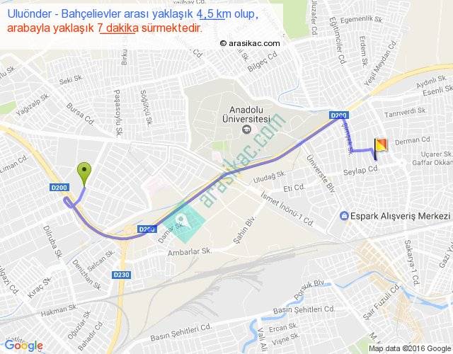 Uluönder - Bahçelievler arası yaklaşık olarak 90 km/h ile yukarıda belirtilen sürede olup, iki yerin kuş uçuşu uzaklığı (mesafesi) 3'dir. Yolculuk otobüsle 9 dakika sürmektedir.