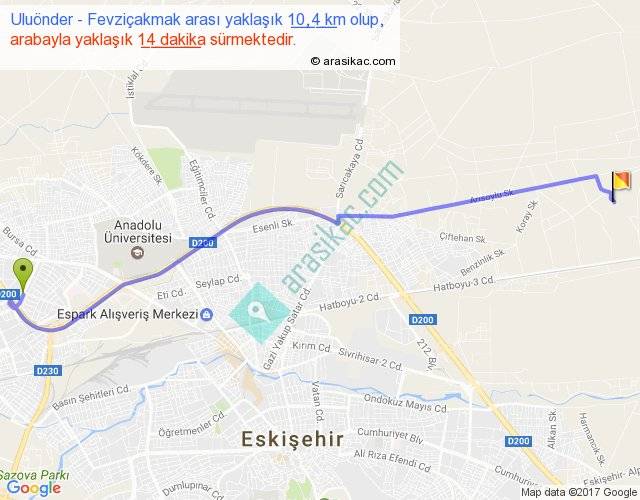Uluönder - Fevziçakmak arası yaklaşık olarak 90 km/h ile yukarıda belirtilen sürede olup, iki yerin kuş uçuşu uzaklığı (mesafesi) 9'dir. Yolculuk otobüsle 18 dakika sürmektedir.