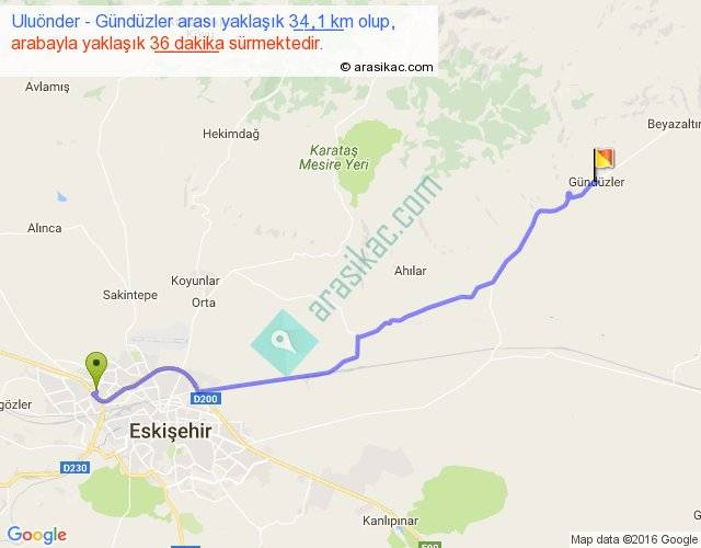 Uluönder - Gündüzler arası yaklaşık olarak 90 km/h ile yukarıda belirtilen sürede olup, iki yerin kuş uçuşu uzaklığı (mesafesi) 29'dir. Yolculuk otobüsle 46 dakika sürmektedir.