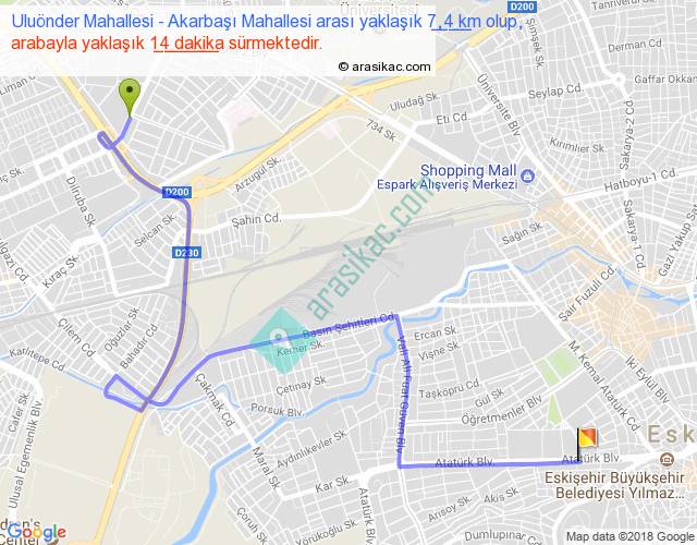 Uluönder Mahallesi - Akarbaşı Mahallesi arası yaklaşık olarak 90 km/h ile yukarıda belirtilen sürede olup, iki yerin kuş uçuşu uzaklığı (mesafesi) 4'dir. Yolculuk otobüsle 18 dakika sürmektedir.