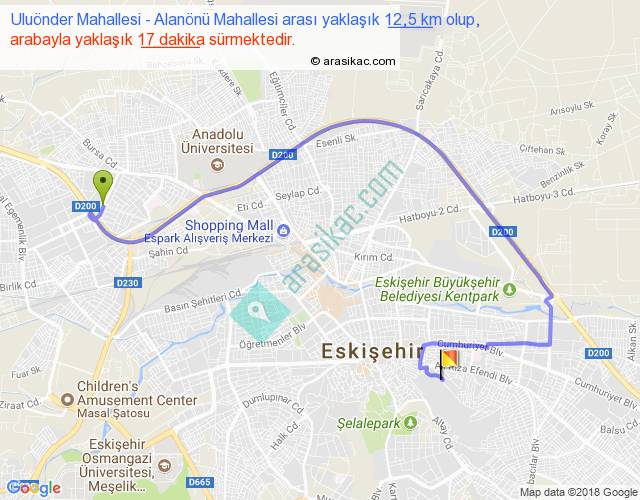 Uluönder Mahallesi - Alanönü Mahallesi arası yaklaşık olarak 90 km/h ile yukarıda belirtilen sürede olup, iki yerin kuş uçuşu uzaklığı (mesafesi) 6'dir. Yolculuk otobüsle 22 dakika sürmektedir.