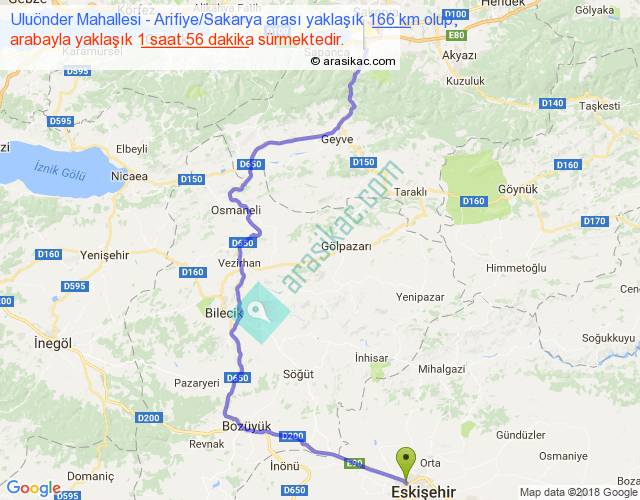 Uluönder Mahallesi - Arifiye Sakarya arası yaklaşık olarak 90 km/h ile yukarıda belirtilen sürede olup, iki yerin kuş uçuşu uzaklığı (mesafesi) 101'dir. Yolculuk otobüsle 2 saat 30 dakika sürmektedir.