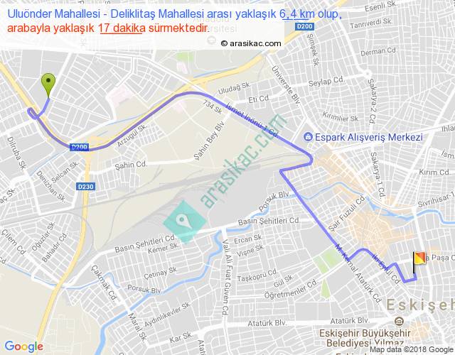 Uluönder Mahallesi - Deliklitaş Mahallesi arası yaklaşık olarak 90 km/h ile yukarıda belirtilen sürede olup, iki yerin kuş uçuşu uzaklığı (mesafesi) 4'dir. Yolculuk otobüsle 22 dakika sürmektedir.